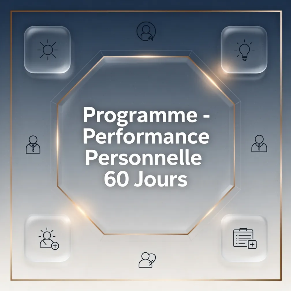 Programme immersif de 60 jours avec 2 modules par semaine (vidéos + exercices), live mensuels et suivi progression. Couvre gestion du temps, énergie personnelle, focus et résultats. Inclut planificateur digital, templates et journal de progrès avec métriques.